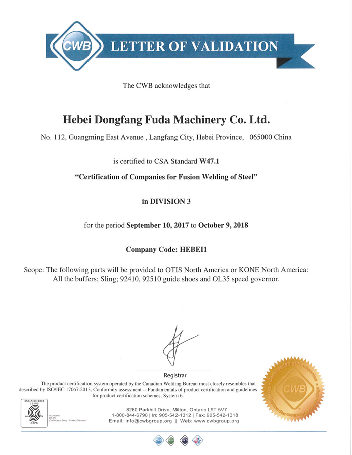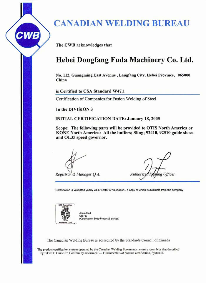 CWB加拿大焊接局(Canadian Welding Bureau)是全球公認最大、最具創(chuàng)新力的焊接(jiē)組織之(zhī)一,是國際焊接協會IIW授權的NB,在SCC授權及監督下執行(háng)CSA焊接相關標準的管理工作。CWB認證是對生產(chǎn)加拿大境(jìng)內鋼結構的焊接製造企業的強製性要求(qiú),並在(zài)北(běi)美及其它地區受到廣泛認可。涉足鋼(gāng)結構(gòu)或鋁(lǚ)結構業務(wù)的焊接製造(zào)企業,對加拿大出口產品或參與加拿大項目時,必須具備CWB認證資格(gé),這也是奧(ào)的斯、通力、迅達等重大客(kè)戶對電梯安全部件供應商(shāng)的強製(zhì)性要求,CWB認證資格是(shì)中國的焊接製造企業進入整個北美市場的快速通道。