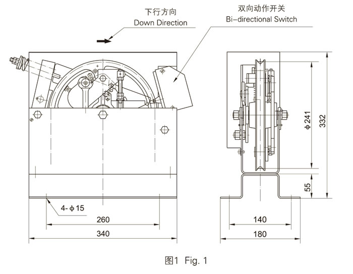 本限(xiàn)速(sù)器適用於上行製動保護裝置為遙控(kòng)夾繩器(qì)的(de)電梯。