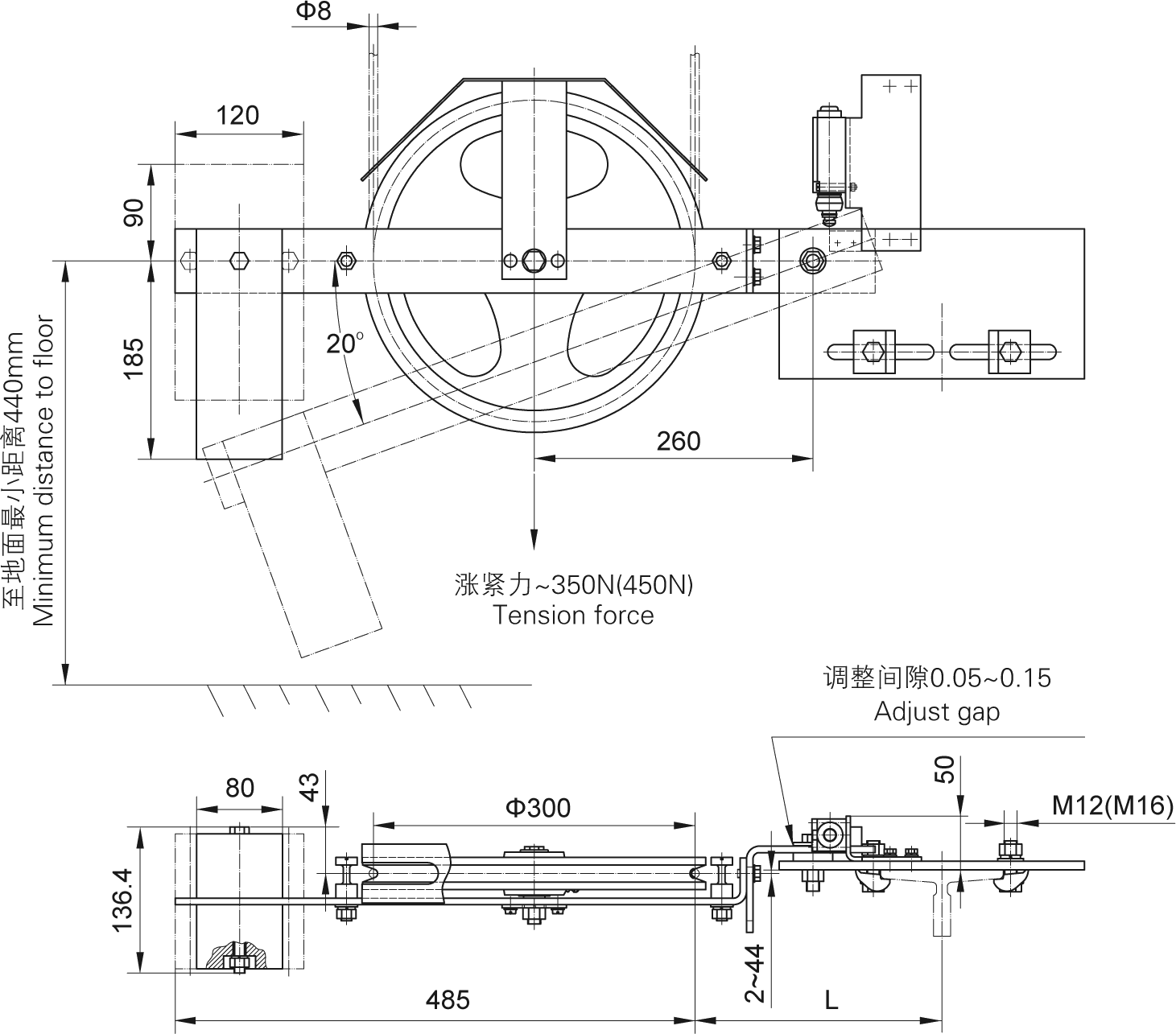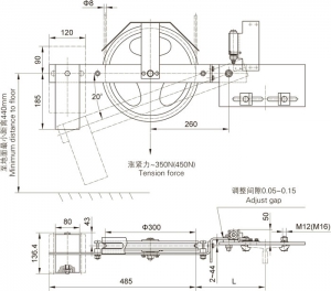 本張緊裝置為擺臂式結(jié)構,漲緊重塊材料為鑄鐵(tiě),位置尺寸的(de)調整範圍見附(fù)表。